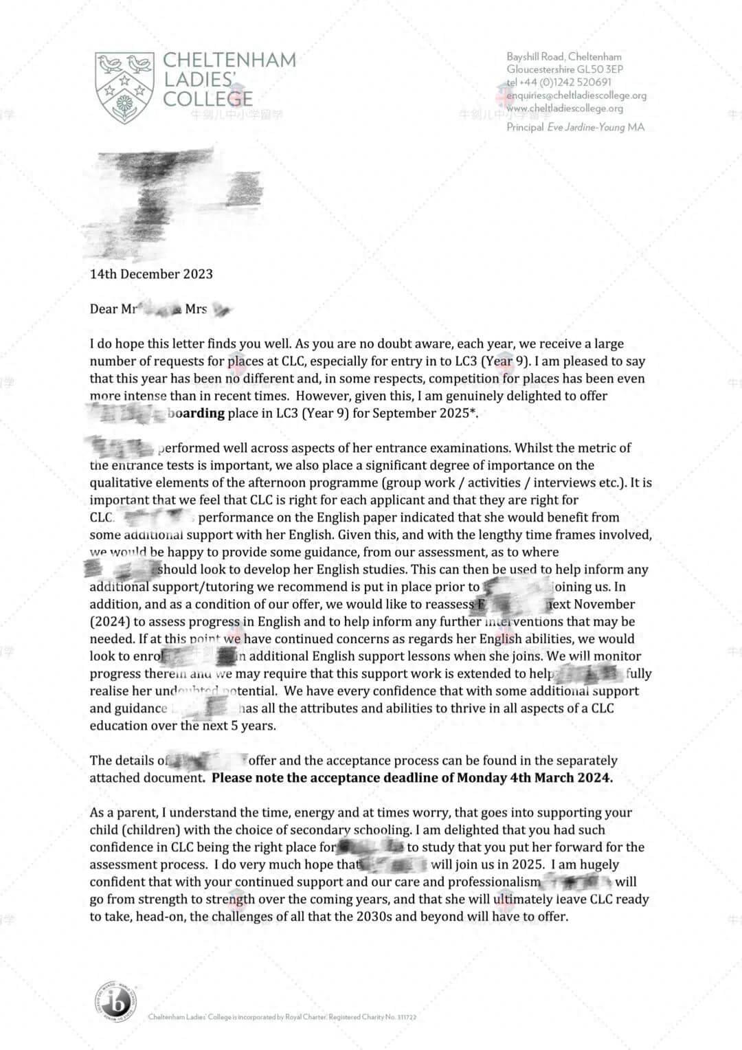 最终小V同学不负众望,拿到了Cheltenham Ladies' College(英国切尔腾纳姆女子学院)13+的录取通知书。