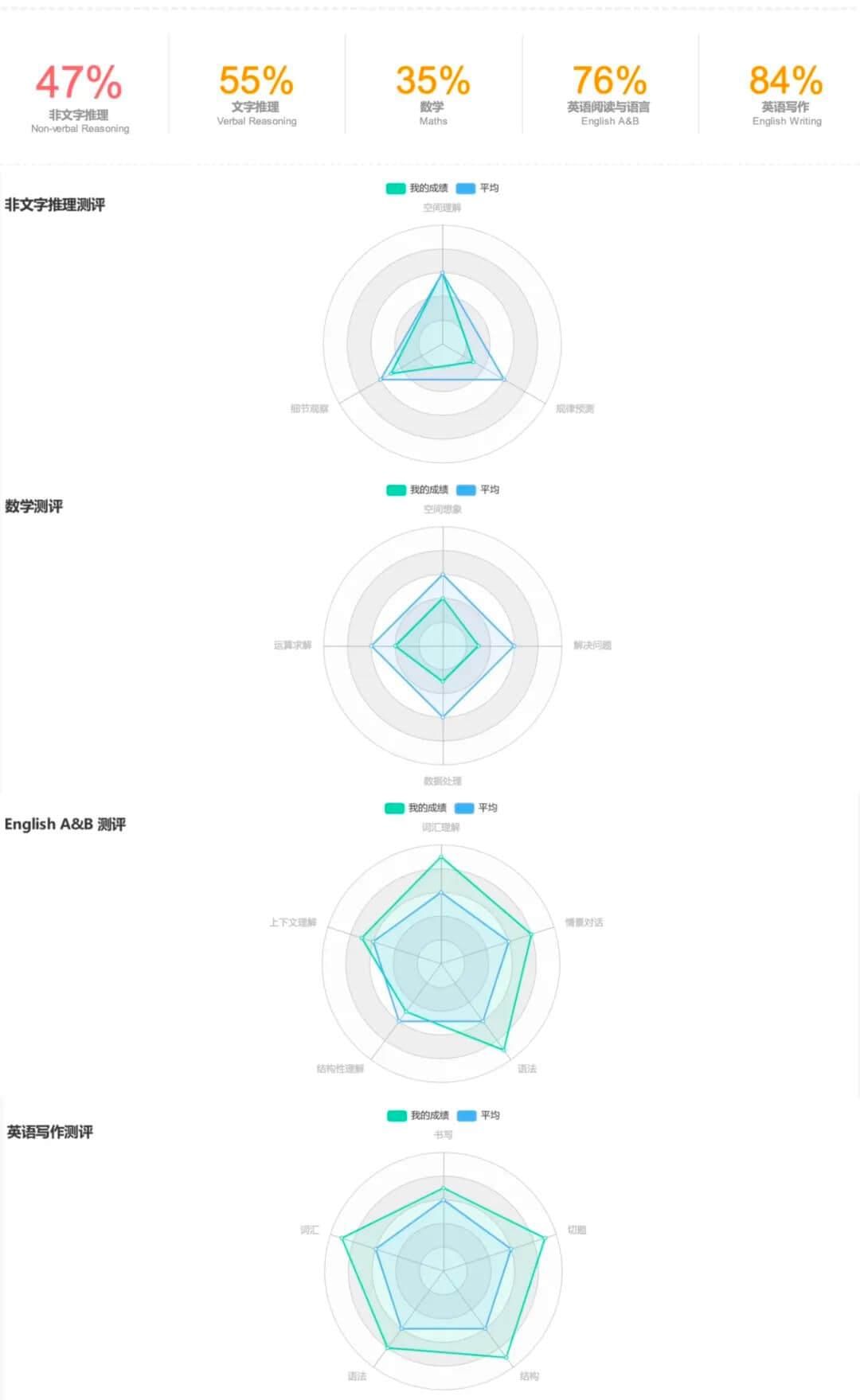 相比较于面试,预录取测试的成绩稍微不尽如人意,从具体正确率来看,NVR47%,VR 55%,Maths 35%,English Reading76%,English Writing84%