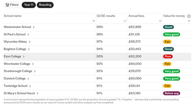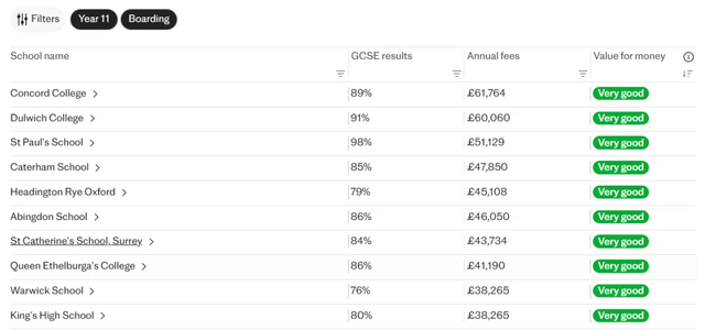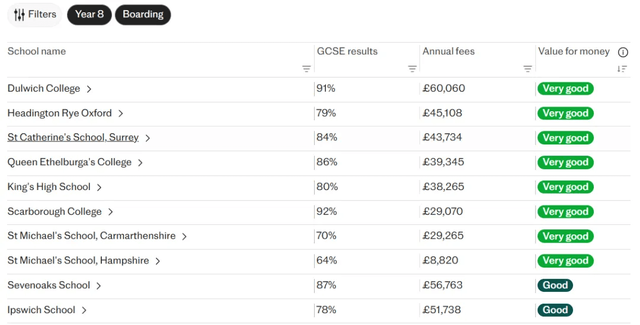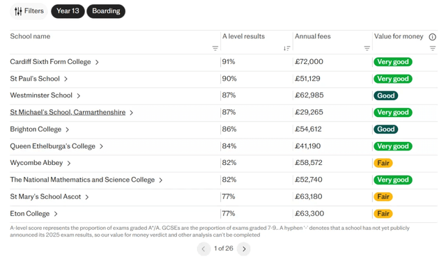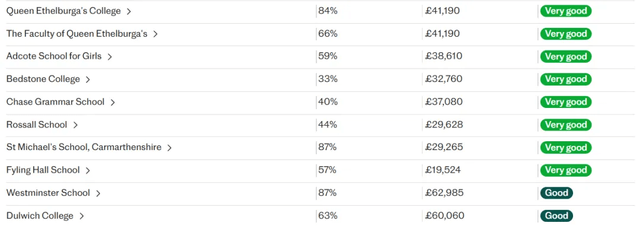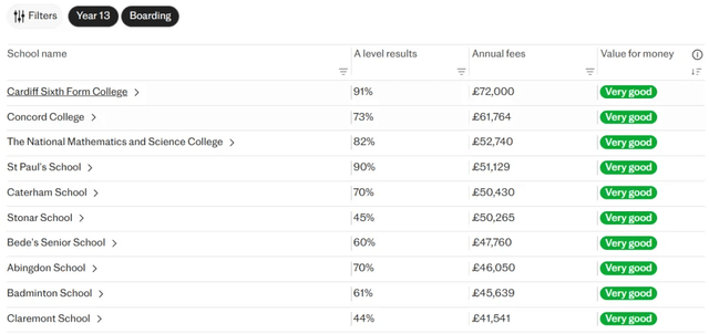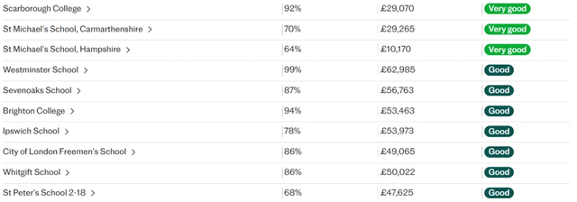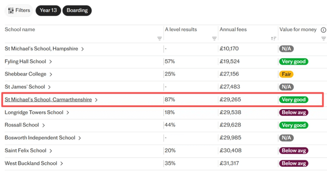 但《每日电讯报》通过分析指出,其实一些知名度较低的私校也能取得同样亮眼的成绩,并且其学费只是知名私校的一小部分。例如,St Michael’s School(卡马森郡的圣迈克尔学校)在这一评估维度上表现优异:该校学费比Cardiff Sixth Form College(卡迪夫中学)低1.4万英镑,但A-Level考试中获得A*-A 的比例仍高达87%。「想了解英国顶级私校平时都学些什么?私信免费领取英国私校课程开设详情列表」