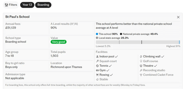 这里以Y13获得最高推荐度的St Paul's School(圣保罗公学)为例,在A-Level阶段有90%的学生拿到了A*-A的分数,在评分涵盖的11项设施指标中占6项:有室内游泳池、网球场、健身房、赛艇训练场地、攀岩墙和剧院,以90%的推荐度远超私立学校平均分和公立学校平均分。