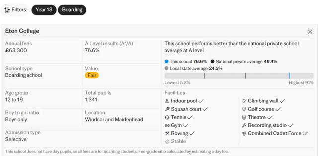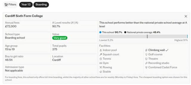 通过《每日电讯报》的调查显示,能够看到Eton College(伊顿公学)在Y11和Y13的评分分别为Poor和Fair,但其在各种活动上能够提供的支持非常丰富,包括室内游泳池、壁球场、网球场、健身房、赛艇运动设施、攀岩墙、高尔夫球场、剧院、录音棚、CCF。而同为学术非常优秀的Cardiff Sixth Form College(卡迪夫中学)校内却仅有攀岩墙一项设施,也可想而知,除了学术之外,学生们几乎不会有额外的时间和机会去发展自身的兴趣爱好,这与很多家长的教育诉求不符。
