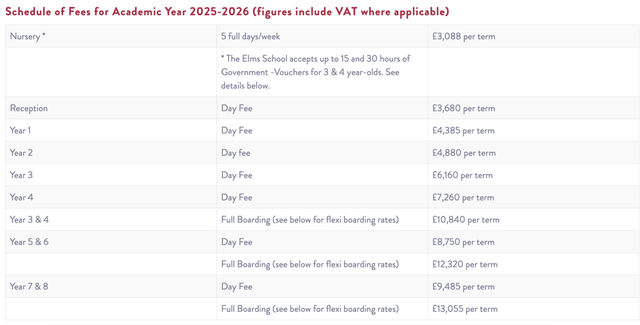 The Elms School(榆树小学)为学生们提供了走读和寄宿的选择,具体每个学期的费用如下图所示(已包含VAT在内):