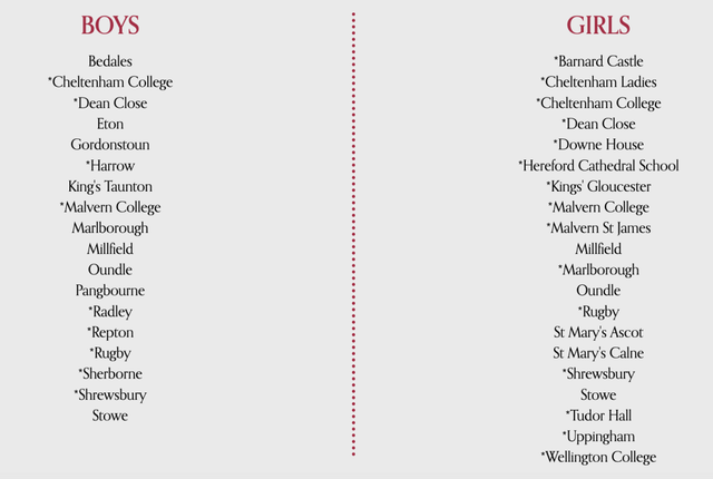 毕业生去向方面,The Elms School(榆树小学)不仅收获了众多顶级中学Offer,包括了Eton College(伊顿公学)、Harrow School(哈罗公学)和Oundle(奥多中学)、Downe House(唐屋女子中学)和Wellington College(惠灵顿公学)等,还有很多学生拿到了包括学术、艺术、戏剧在内的中学奖学金。具体毕业去向详见下图: