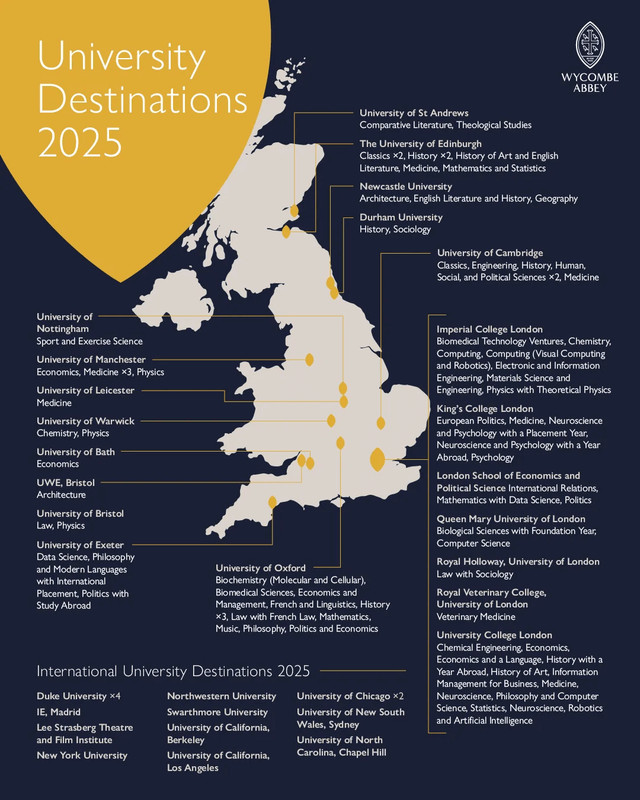 在2025年最新的A-Level考试中,Wycombe Abbey(威雅公学)有76.2%的学生拿到了A*-A的成绩,同年的GCSE考试中则有97%的学生取得7-9分的分数。