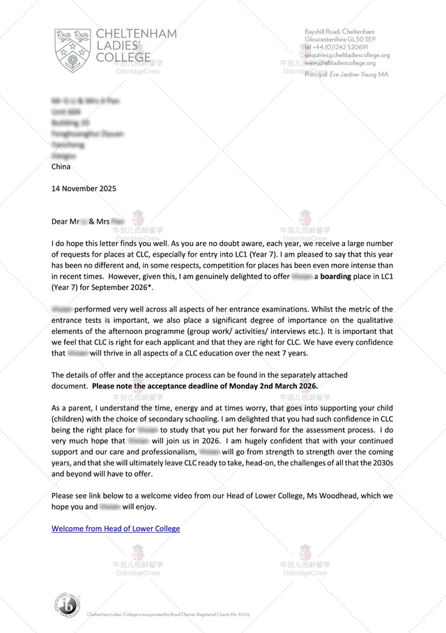 恭喜小V同学收获英国顶级中学Cheltenham Ladies' College(英国切尔腾纳姆女子学院)的Offer录取书!这是一所学术水平非常高的女校,尤其是其IB成绩常年保持着数一数二的地位,学校常年在各大教育榜单上备受赞誉。