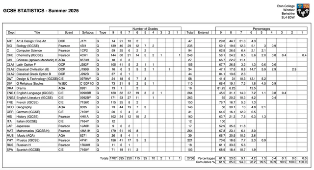 GCSE方面,Eton College(伊顿公学)排在榜单的第17位,7-9分的比例达到了94.05%,是排名第二的寄宿制男校,而排名第一位的寄宿制男校则是Tonbridge School(汤布里奇公学),7-9分的学生人数比例为95.57%,二者相差并不大,仅有1.52%。在Eton College(伊顿公学)公布成绩之前,排在第二位的寄宿制男校则是Dulwich College(德威学院),7-9分比例为93.45%。