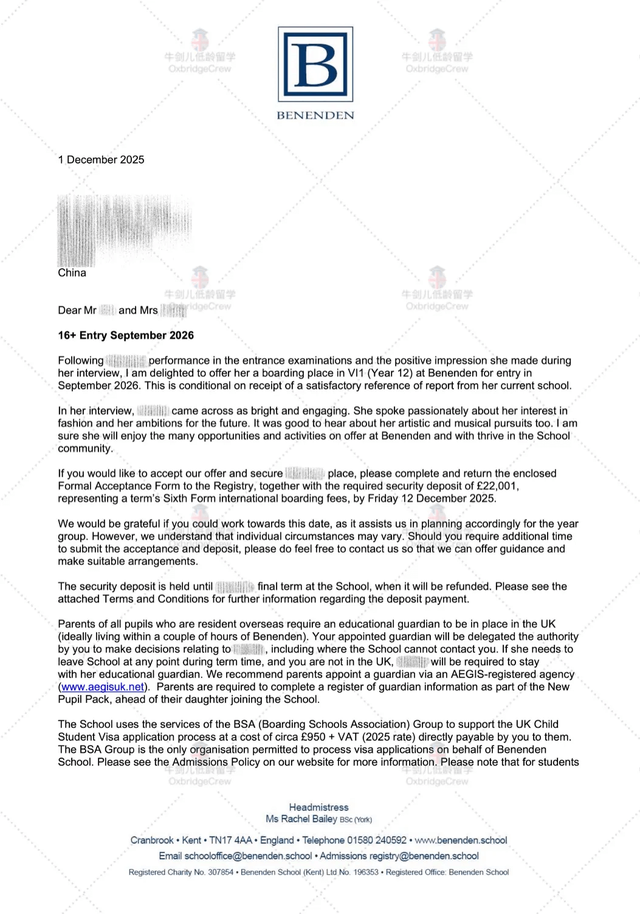恭喜小A同学收获英国顶级中学Benenden(博耐顿学校)的16+录取通知书!该校一直以来都受到各界名流的青睐,是英国安妮公主的母校,澳门赌王何鸿燊的小女儿何超欣就是毕业于这所学校,王诗龄的入读更是让这所学校在国内名声大噪。