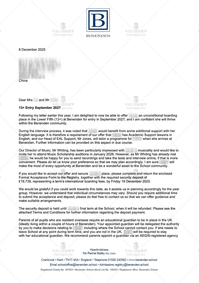 恭喜小E同学收获英国顶级中学Benenden(博耐顿学校)的录取通知书!该校一直以来都受到各界名流的青睐,是英国安妮公主的母校,澳门赌王何鸿燊的小女儿何超欣就是毕业于这所学校,王诗龄的入读更是让这所学校在国内名声大噪。