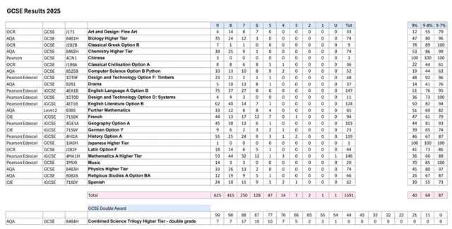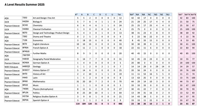 在2025年的A-Level考试中,Radley College(拉德利公学)有超过61%的学生拿到了A*-A的成绩。此外,有87%的学生在GCSE的考试中拿到了7到9分的分数。具体每门科目的表现详见下图:
