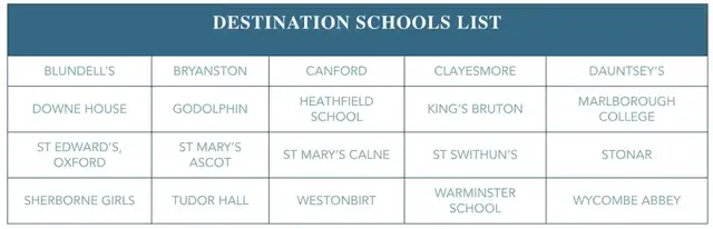 协助女生们选择并申请合适的中学,是Hanford(汉福德预备学校)的重要使命之一。许多女生会升入它的姐妹学校——Sherborne Girls School(谢伯恩女子学校),同时也有一大批学生进入其他各类顶尖中学。学校的校长希拉里·菲利普斯时常与本地及更远地区的顶尖中学校长们保持交流,并有意识地定期走访这些学校。这些走访有助于老师们及时了解各校最新的入学要求、校园文化和教育理念。过去十年间,Hanford(汉福德预备学校)的所有女生均成功获得了其第一志愿中学的录取。具体的毕业生去向如下图所示: