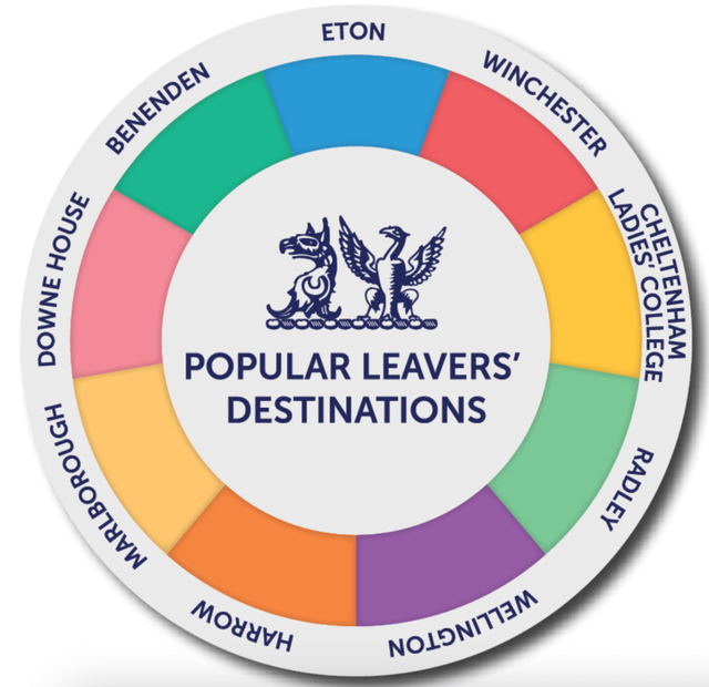 学校在2025年具体的毕业生去向为Harrow School(哈罗公学)2人,Benenden(博耐顿学校)1人,Eton College(伊顿公学)5人、Uppingham(阿宾汉姆中学)、Oundle(奥多中学)、Marlborough College(马尔波罗学院)、Radley College(拉德利公学)、Downe House(唐屋女子中学)、Eastbourne College(伊斯堡学院)、Winchester College(温彻斯特公学)1人、Worth School(沃斯学校)2人、Bryanston(布莱恩斯顿学校)1人、Brighton College(布莱顿公学)1人、Bede's(比德中学)、Seaford College(希弗德学院)和Bradfield College(布莱德菲尔德学院)各一人。