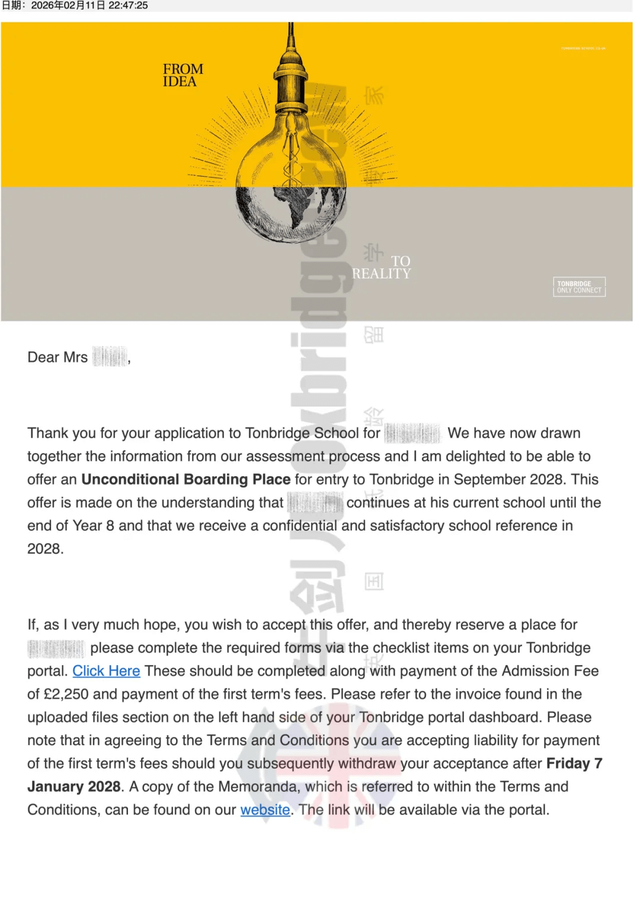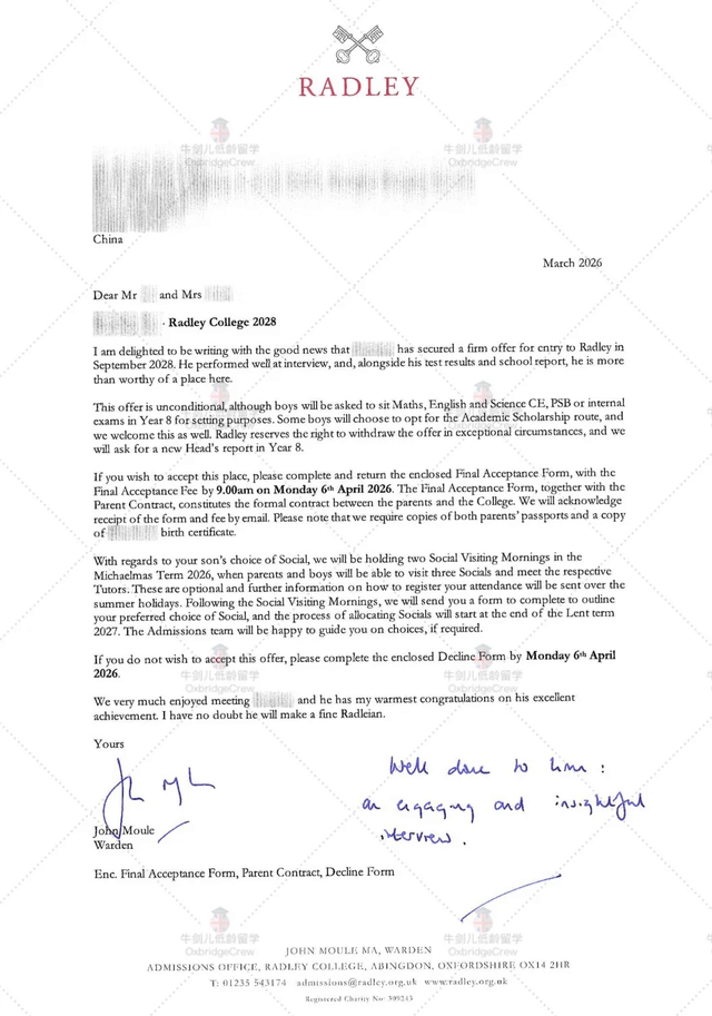 恭喜小B同学收获两所英国老牌公学Tonbridge School(汤布里奇公学)和Radley College(拉德利公学)的Offer录取书!