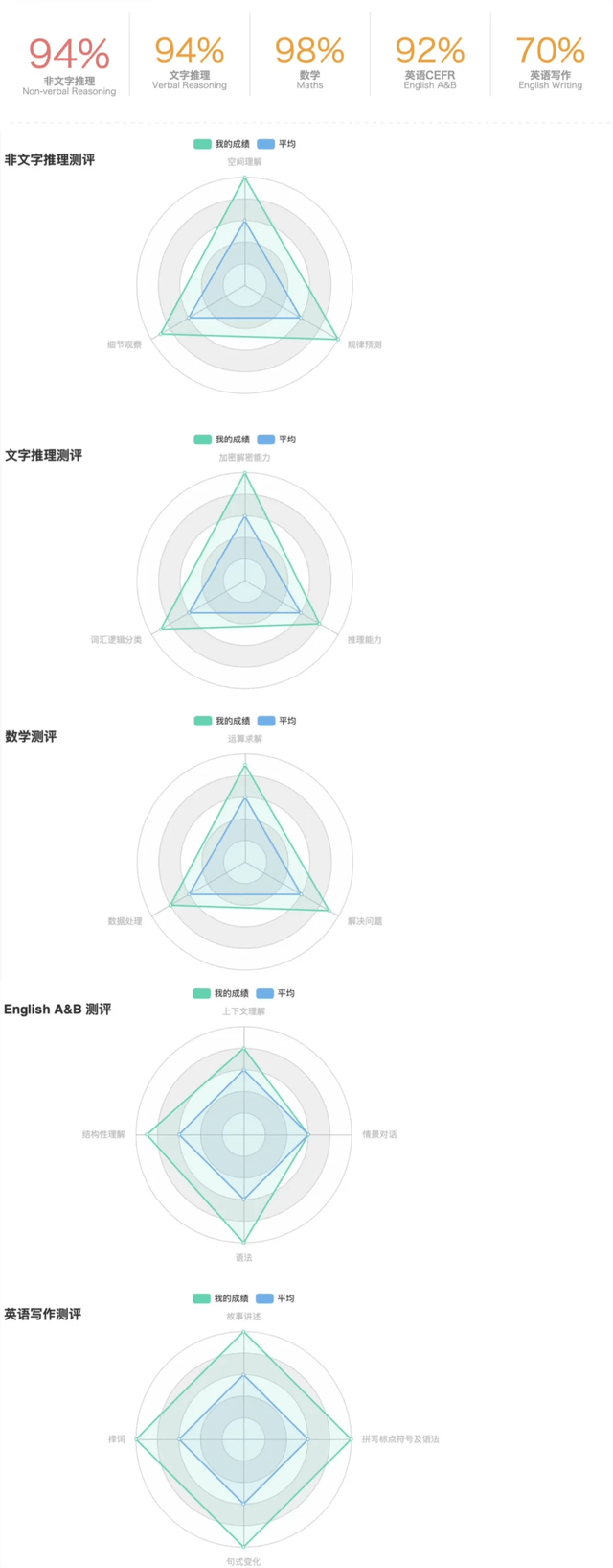 在牛剑儿的初次摸底测试中,小B同学的学术表现非常优秀,非文字推理、文字推理、数学和英语都没有出现短板,并且各项的表现水平都遥遥领先于同龄小朋友。