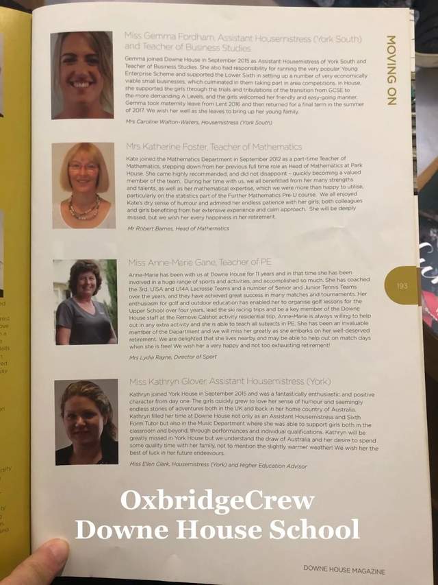 Downe House (唐屋女子中学) 的校长Anna Dourountakis女士表示“我们的理念是与家长合作,以确保孩子的学习经历是个性化的,学术严谨,并允许探索知识辅之以创造性思维。”