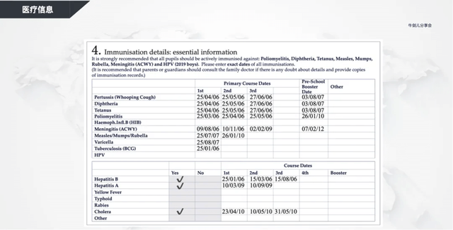 开学前的准备可以大致分为三类,分别是医疗信息、药物许可和课外活动选择。关于医疗信息,首先需要提供学生的接种疫苗本以及相关信息。英国私校需要知道目前孩子接种过哪些疫苗,因为当地对于疫苗接种的要求是和国内不一样的,例如HPV疫苗。英国当地的孩子无论是男生还是女生,都会在11岁左右进行接种,而国内则并未范围的普及。当然,学校会在征得家长的允许之后再进行接种。
