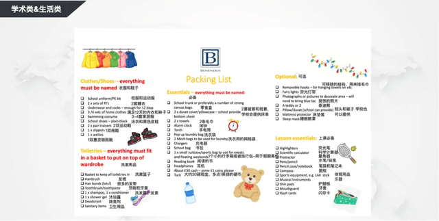 学习类方面,行李箱里可以携带一些孩子自己的文具用品,例如圆珠笔、水彩笔、橡皮擦等等可以装在笔袋里。Y9之后学校对使用的计算机型号也有固定的要求。