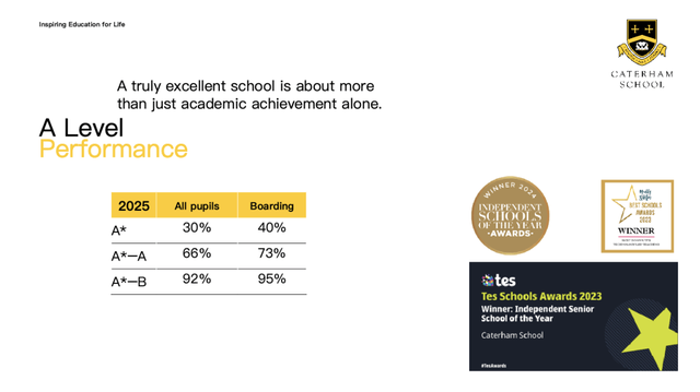 Mr.Wood:在GCSE成绩上表现得更好,在Y11年级我们有160名学生,他们都选择了10-12门GCSE课程。有51%的学生拿到了9分的好成绩,7-9分的学生比例则达到了92%。这也让我们成为了英国学术排名第二的混校。「想了解更多顶级私校备考细节?私信查看分享会完整视频回顾」
