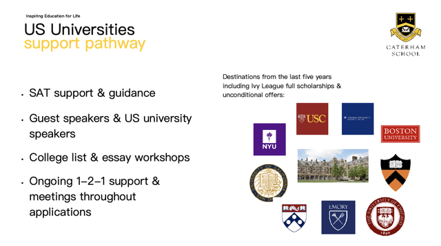 Mr.Wood:学校在帮助学生们申请美国大学上有着完整的体系。包括每年都会有老师前往美国的大学进行深度交流和实地考察,美国大学每年也都会派人来Caterham School(凯特汉姆学校)做一些申请相关的分享。此外,会给予申请美国大学的学生一对一支持。